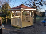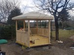 Drewniana sześciokątna altana ogrodowa o średnicy 350 cm doskonale będzie pełnić rolę centrum ogrodowego wypoczynku. Dzięki prostej budowie, altanę łatwo zmontować, a niewielka powierzchnia zabudowy umożliwia budowę bez zezwolenia budowlanego.