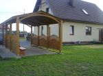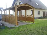 Wykonana z drewna giętego jednostanowiskowa wiata garażowa Alaska Ibardzo dobrze sprawdzi się przy domu jednorodzinnym. Wiatę można wybudować bez pozwolenia budowlanego.