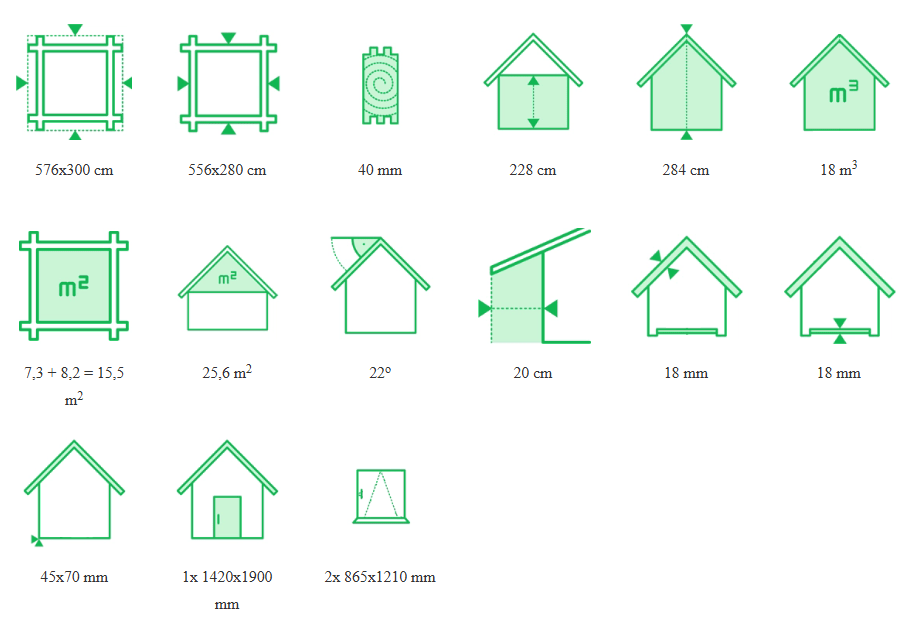 Bez wystających elementów konstrukcyjnych wymiary domku wynoszą 556 × 280 cm. Powierzchnia użytkowa wnętrza to 7,3 m², natomiast zadaszony taras ma powierzchnię 8,2 m², co zapewnia dodatkową przestrzeń do wypoczynku na świeżym powietrzu.