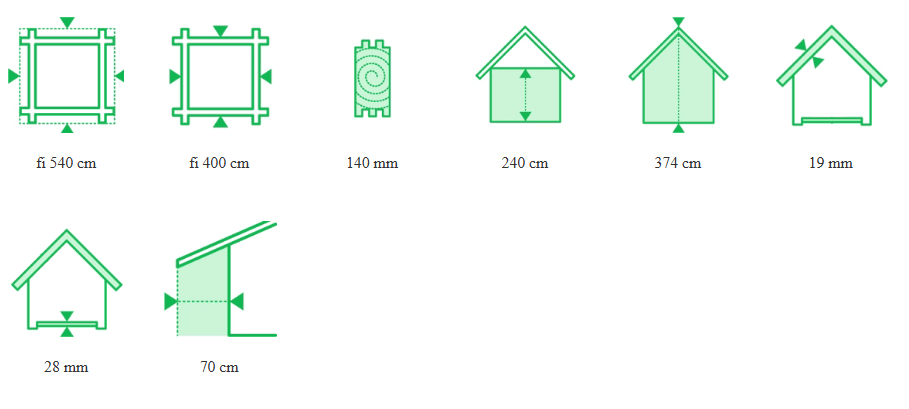Średnica altany bez wypustu dachu wynosi 400 cm, natomiast wraz z dachem konstrukcja osiąga 540 cm średnicy. Altana została zwieńczona ośmiospadowym dachem o grubości 19 mm, który w najwyższym punkcie osiąga wysokość 354 cm.