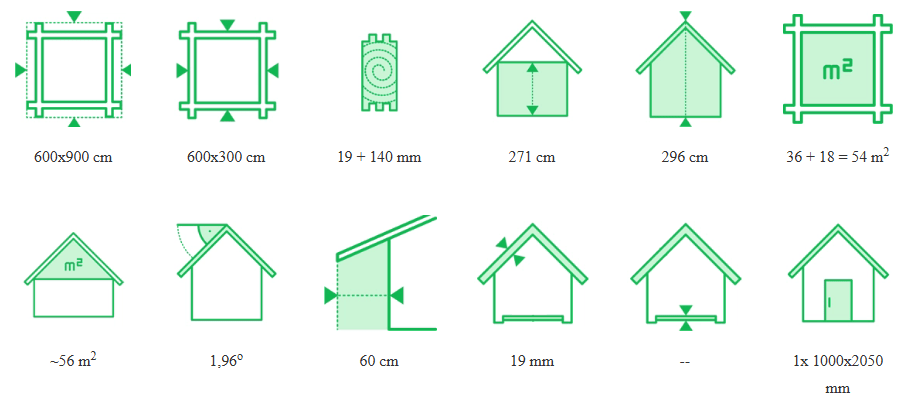Całkowity wymiar wiaty wynosi 900 × 600 cm, z czego 300 × 600 cm stanowi boczne pomieszczenie o zamkniętej konstrukcji. Wysokość budynku wynosi 296 cm po wyższej stronie oraz 271 cm po niższej stronie.