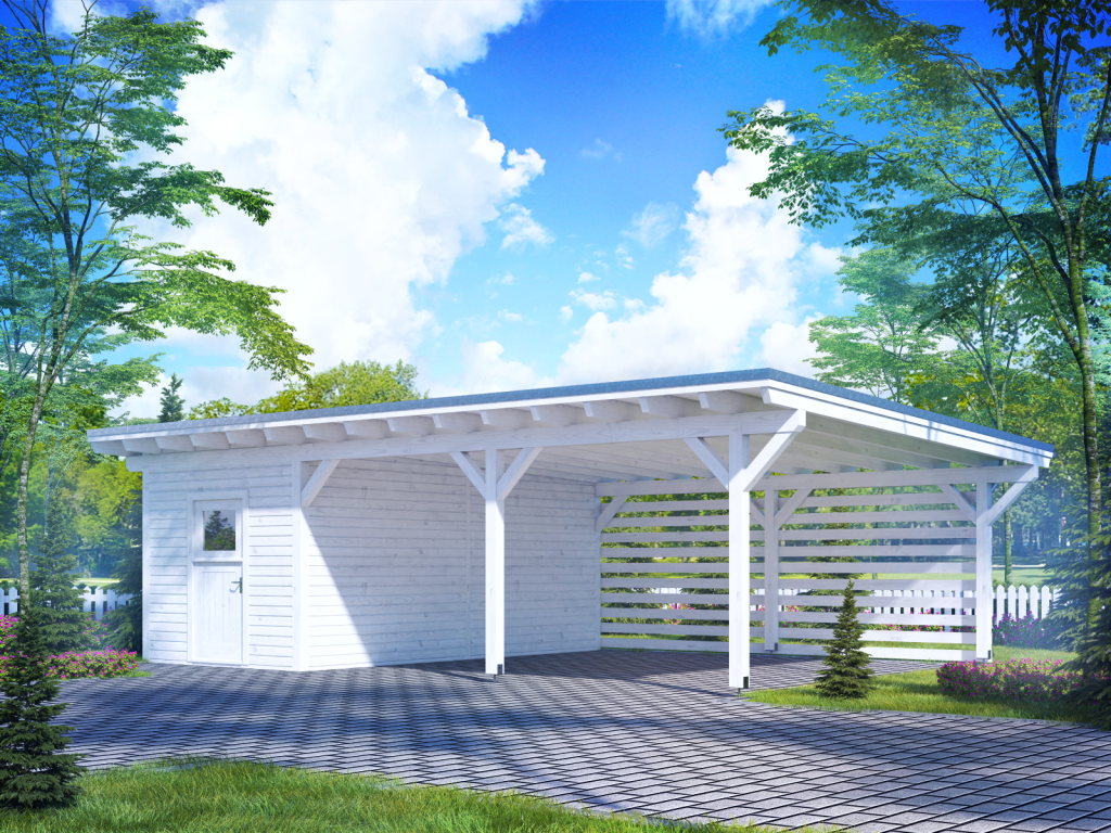 Drewniana wiata Idaho z płaskim dachem i półotwartą przestrzenią to funkcjonalne rozwiązanie, które pozwala w pełni wykorzystać i rozszerzyć możliwości zagospodarowania przydomowej przestrzeni. Zadaszona powierzchnia z łatwością pomieści dwa samochody osobowe lub samochód wraz z przyczepą, natomiast boczne pomieszczenie może służyć jako praktyczny schowek na akcesoria samochodowe, narzędzia lub sprzęt ogrodowy. Wymiary konstrukcji pozwalają na jej budowę bez konieczności uzyskania pozwolenia na budowę.