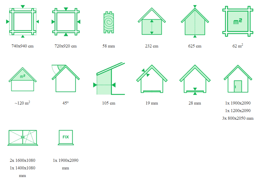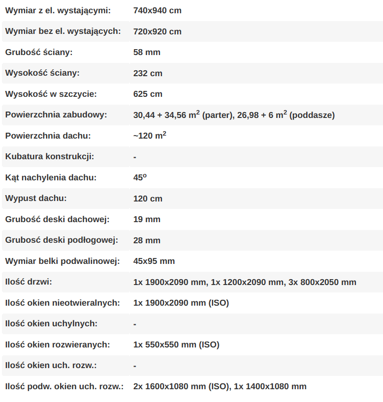 Budynek posiada wymiary zewnętrzne równe 740×940 cm, z czego 500×700 cmprzypada na powierzchnię zabudowy. Ściany o grubości 58 mm mają wysokość 232 cm. Budynek w najwyższym punkcie kalenicy osiąga 625 cm wysokości. Wykonany z deski o grubości 19 mm pełny, dwuspadowy dach ma 45o nachylenia oraz powierzchnię całkowitą wynoszącą 120 m2. Podłoga wewnątrz domku oraz na całej powierzchni tarasu wykonana jest z deski o grubości 28 mm. Alicję II od podłoża izolują impregnowane podwaliny o wymiarze w przekroju 45×95 mm