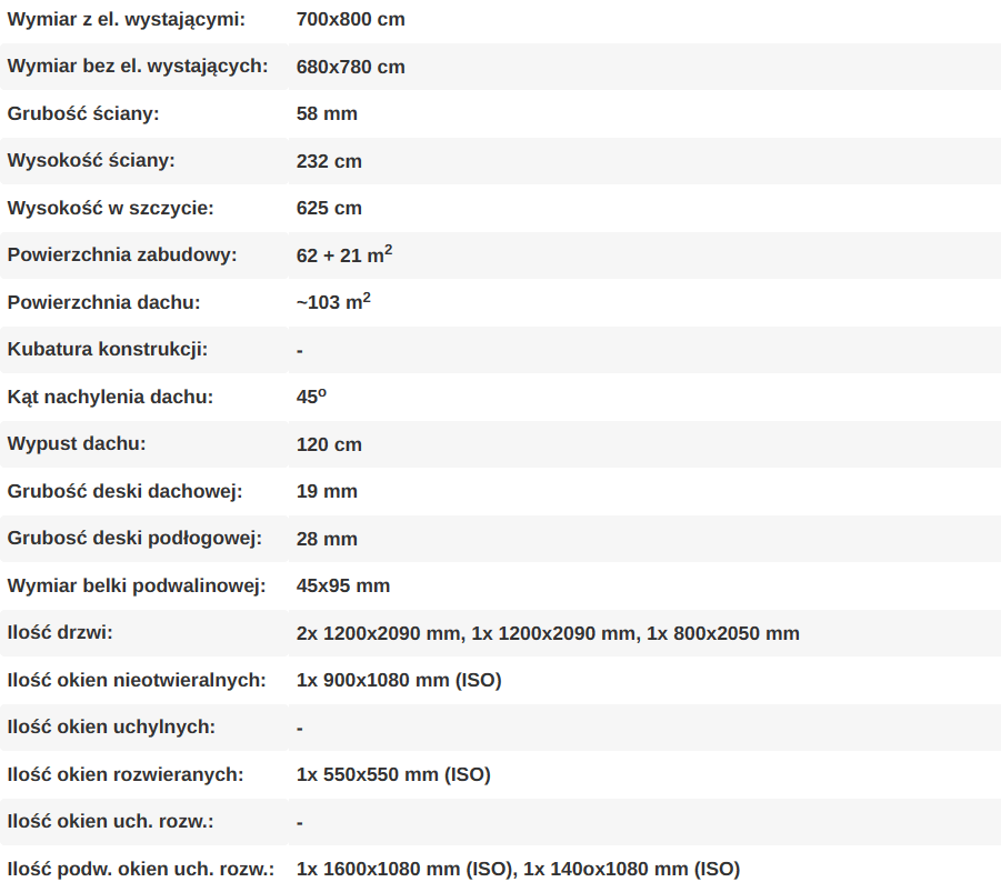 Alicja III razem z tarasem oraz wszelkimi wypustami konstrukcyjnymi zajmuje obszar o wymiarach 700×800 cm, z czego 700×500 cm przypada na powierzchnię zabudowy. Wykonane z bala świerkowego ściany mają 58 mm grubości. Budynek ma wysokość ścian równą 232 cm, a najwyższym punkcie kalenicy osiąga 625 cm. Alicję pokrywa dwuspadowy, pełny dach o kącie nachylenia 45o, powierzchni całkowitej 103 m2 oraz grubości 19 mm. Dach kryjący taras wykonany został z płytpoliwęglanu komorowego o grubości 16 mm, dzięki czemu cała powierzchnia tarasu jest jasna, a światło przez przeszklone drzwi wejściowe również do wnętrza parteru. Podłoga w środku jak i na tarasie jest na 28 mm gruba, przy czym na zewnątrz deska jest ryflowana. Cała konstrukcja wykonana jest z niezwyklewytrzymałego i trwałego świerku skandynawskiego poddawanego precyzyjnej, cyfrowej obróbce drewna. Dzięki temu domek można zmontować samodzielnie, ale i późniejsza konserwacja jest łatwa i bezproblemowa. Alicja III stawiana jest naimpregnowanych belkach podwalinowych o rozmiarze w przekroju 45×95 mm, które znakomicie izolują domek od wilgoci podłoża.