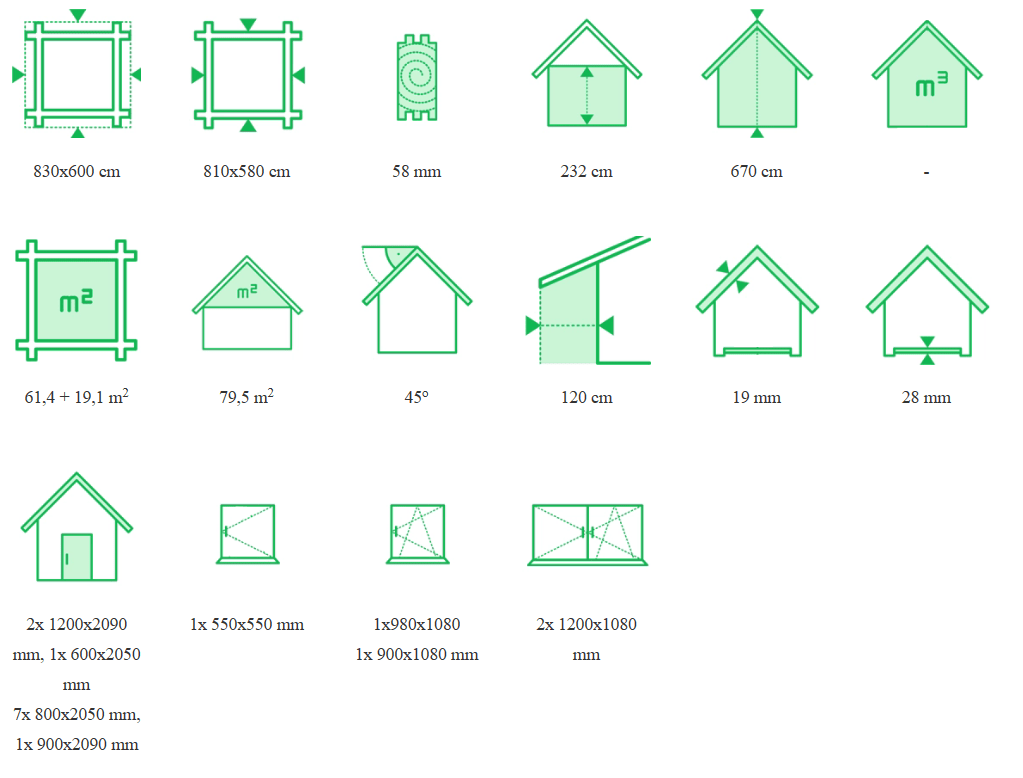 Karolina została zwieńczona dwuspadowym symetrycznym dachem o grubości 19 mm, 45-stopniowym nachyleniu i powierzchni równej 79,5 m2. Domek w najwyższym punkcie mierzy 670 cm wysokości. Ściany mają grubość 58 mm, 232 cm wysokości na parterze oraz 309 cm w najwyższym punkcie poddasza. Od podłoża domek jest oddzielony 28 mm deską oraz belkami podwalinowymi o profilu 45×95 mm. Karolina bez tarasu z wypustami ma wymiar zewnętrzny 830×600 cm, nie licząc wypustów 820×580 cm. Taras znajdujący się na parterze mierzy 210×580 cm, natomiast balkon na piętrze 120×580 cm. Konstrukcja domku jest stabilna, a każdy jej element został dopasowany dzięki cyfrowej obróbce.