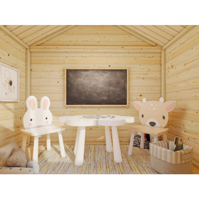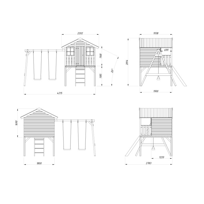 - Konstrukcja domku ustawiona na podwyższeniu, co zwiększa atrakcyjność zabawy
