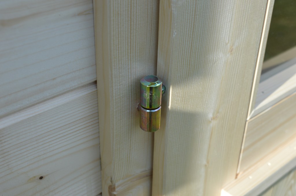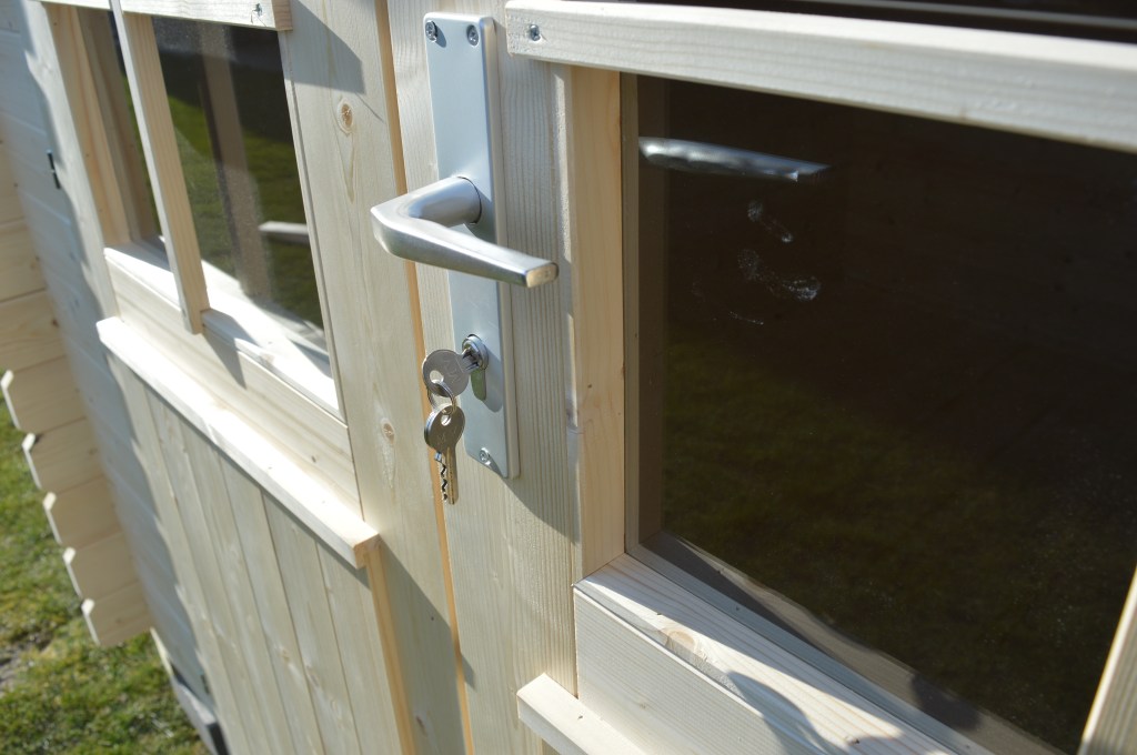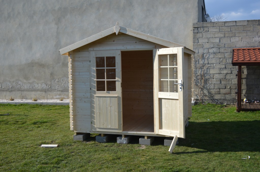 Z przodu domku znajdują się duże, dwuskrzydłowe, częściowo przeszklone drzwi wejściowe, które zapewniają wygodny dostęp do wnętrza. W środku znajduje się jedno pomieszczenie o powierzchni 5,3 m², idealne do przechowywania narzędzi ogrodowych lub sprzętu.