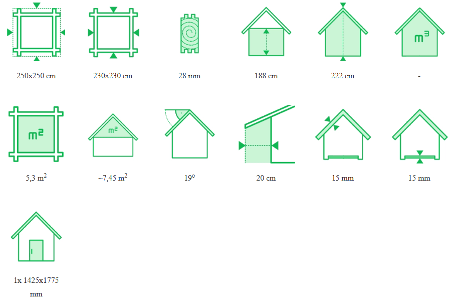 Całkowite wymiary domku wynoszą 250 × 250 cm, natomiast bez wystających elementów konstrukcyjnych 230 × 230 cm. Ściany wykonano z bala o grubości 28 mm i wysokości 188 cm, a w najwyższym punkcie kalenicy domek osiąga 222 cm wysokości.