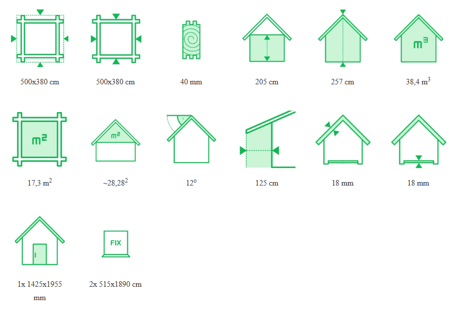 Bez wystających elementów konstrukcyjnych oraz wypustu dachu domek ma wymiary 480 × 360 cm. Licząc wszystkie elementy konstrukcyjne, całkowite wymiary wynoszą 500 × 505 cm. Ściany wykonano z bala o grubości 40 mm, a ich wysokość wynosi 205 cm.
