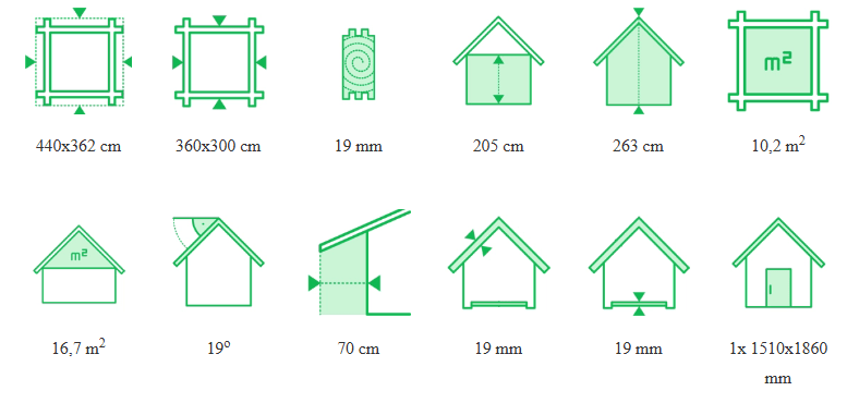 Wymiary zewnętrzne domku wynoszą 440 × 362 cm, z czego 360 × 300 cm stanowi powierzchnia zabudowy. Ściany wykonano z bala świerkowego o grubości 44 mm, a ich wysokość wynosi 205 cm. W najwyższym punkcie kalenicy domek osiąga wysokość 263 cm.
