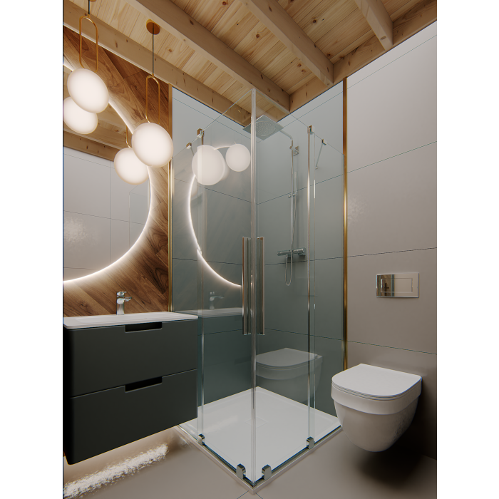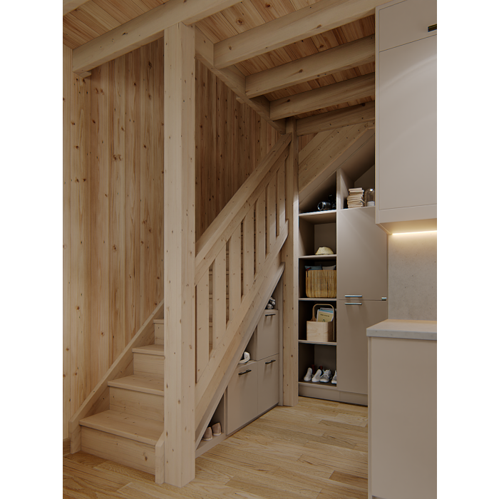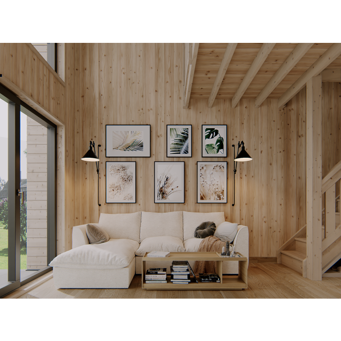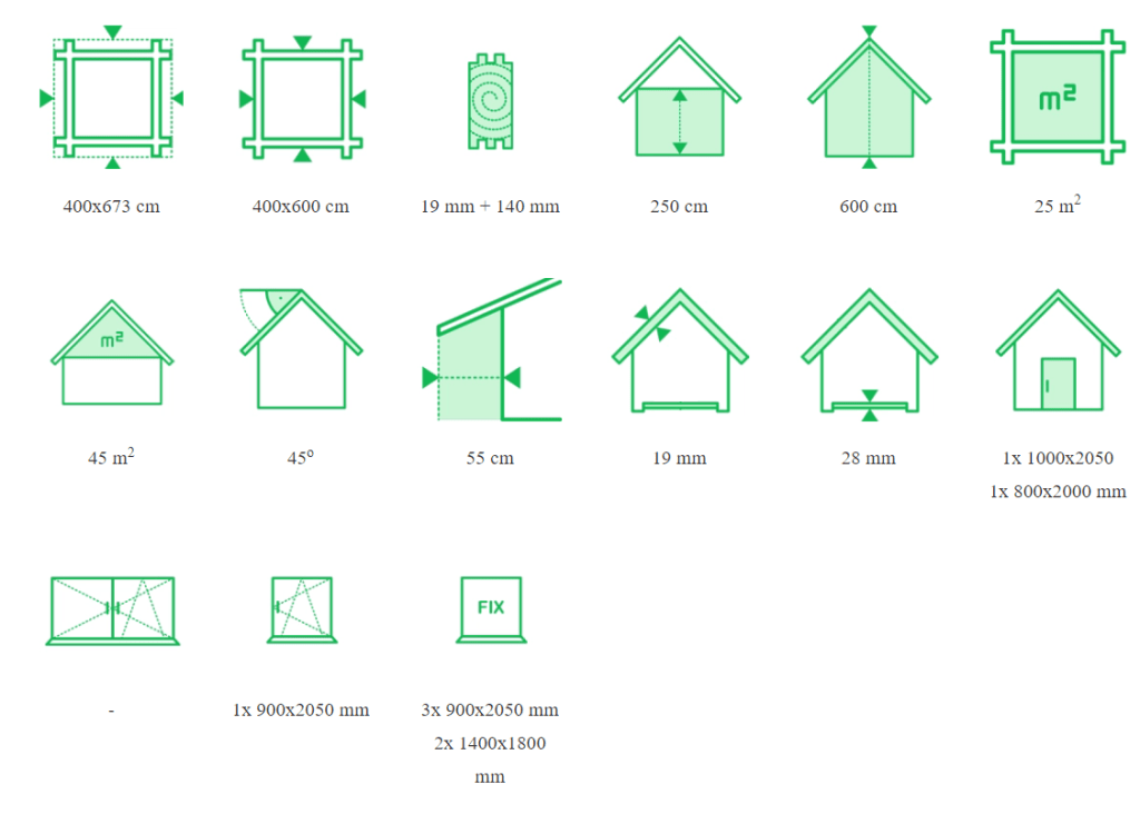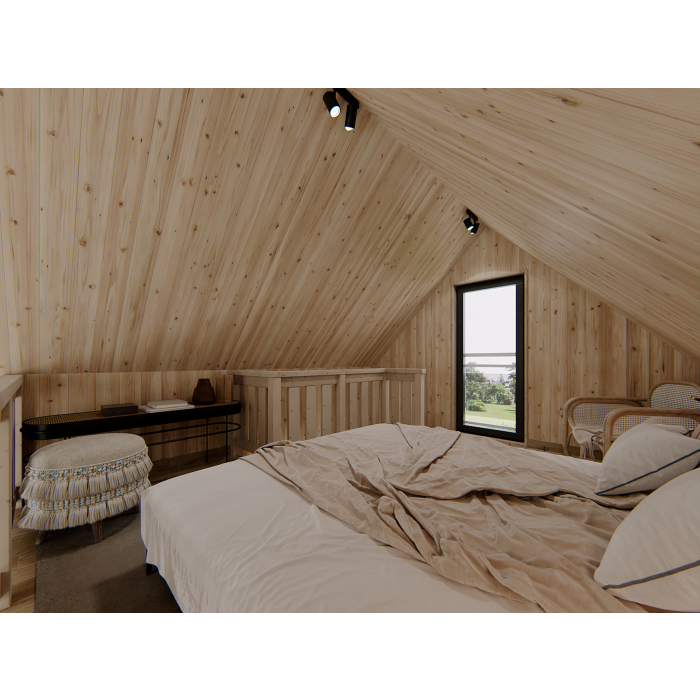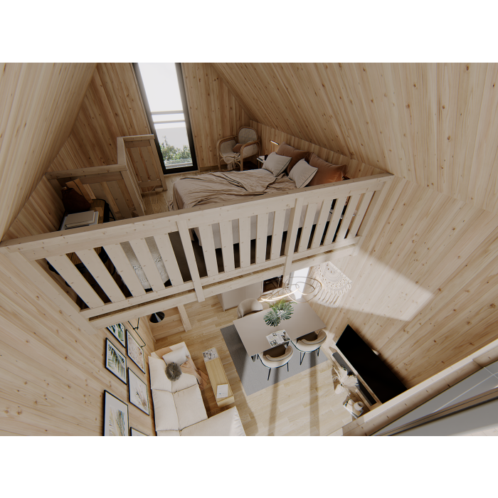 Ten model ma 25 m2 powierzchni części zamkniętej – parteru, plus antresolę o powierzchni około 16 m2. Na antresoli, która jest zabezpieczona balustradą, prowadzą wygodne schody zabiegowe. Licząc najbardziej wysuniętą część zadaszenia przed wejściem – domek ma wymiary 400×673 cm. Ściany zostały wykonane w konstrukcji szkieletowej ze świerku skandynawskiego o najlepszej jakości. Drewno, zanim zostanie poddane cyfrowej obróbce, jest czterostronnie strugane, a następnie suszone. Podłoga domku ma 28 mm grubości, a wykonany z tego samego surowca, co ściany legar podwalinowy, ma wymiary 45×95 mm. Domek został zwieńczony symetrycznym, dwuspadowym dachem o nachyleniu 45 stopni, który w standardzie jest deskowany deską świerkową o grubości 19 mm.
