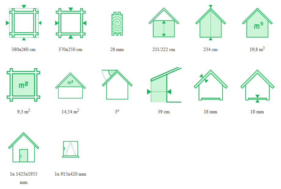 Bez wystających elementów konstrukcyjnych domek ma wymiary 370 × 250 cm, natomiast całkowity wymiar wynosi 380 × 260 cm. Ściany budynku wykonano z bala o grubości 28 mm, a ich wysokość wynosi 222 cm z przodu oraz 211 cm z tyłu.