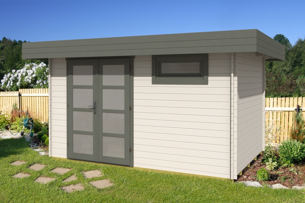 Nowoczesny wygląd domku podkreślają płaski dach oraz stylowe przeszklenia. Szerokie drzwi umożliwiają łatwe przenoszenie większych przedmiotów, a okno zapewnia komfortowe wietrzenie pomieszczenia. Model ten najczęściej wykorzystywany jest jako wolnostojący schowek ogrodowy lub pomieszczenie magazynowe.
