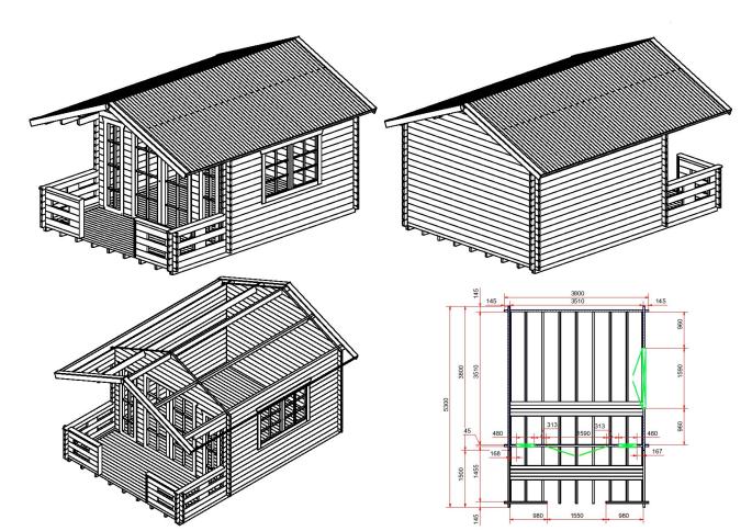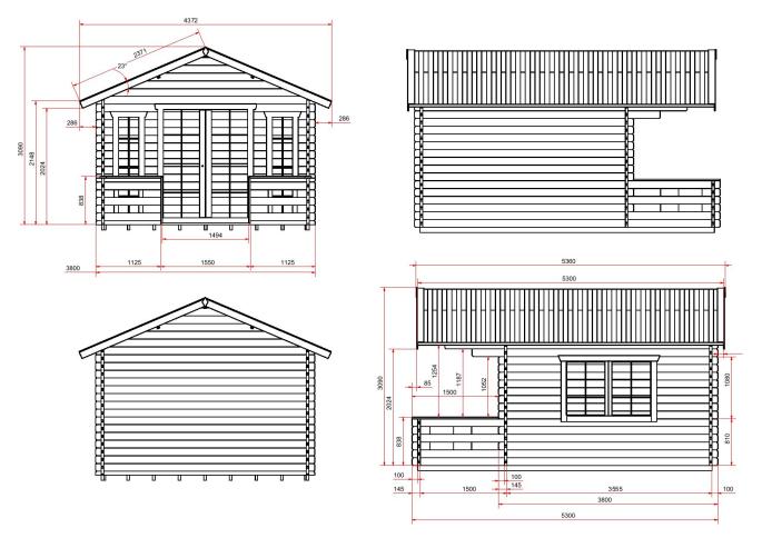 Długość i szerokość domku Igor I z elementami wystającymi i tarasem wynosi 380x530cm, bez elementów 360×510 cm. Wymiar części mieszkalnej to 380×380 cm przy 12 m2 powierzchni użytkowej. Domek w całości został wykonany ze świerkowego litego balika o grubościach 45 mm – ściany, 28 mm – podłoga i 18 mm – dach. Solidna konstrukcja, wysokiej jakości surowiec i odpowiednia impregnacja zapewniają długą żywotność domku.