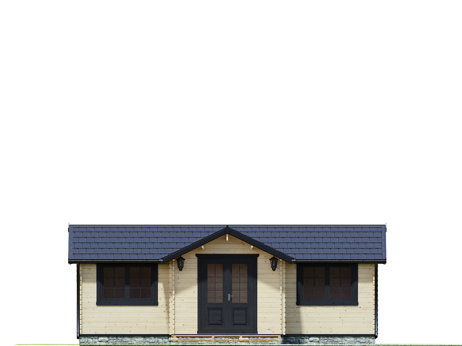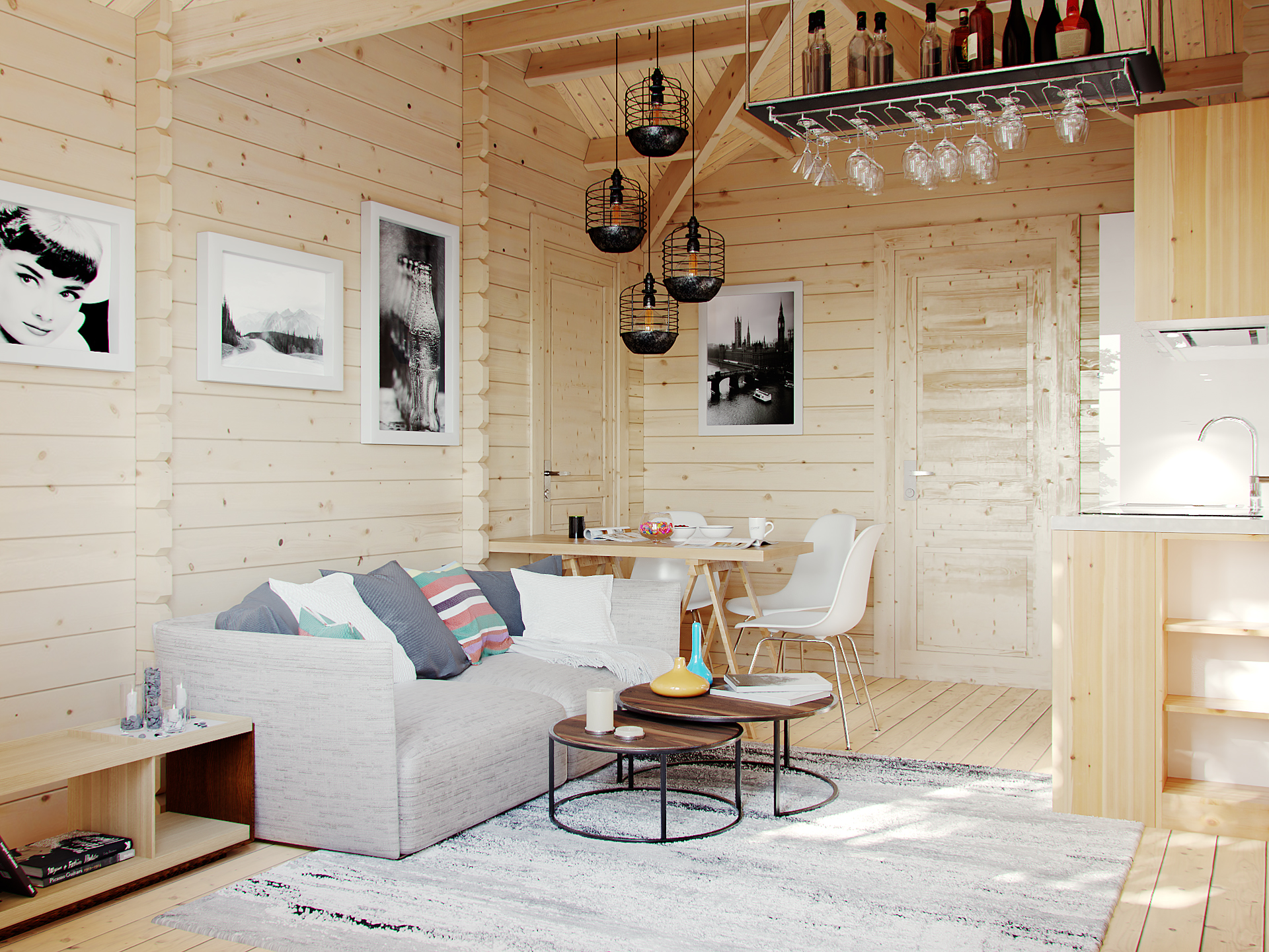 Wnętrze domku składa się z czterech pomieszczeń. Duże, częściowo przeszklone dwuskrzydłowe drewniane drzwi wejściowe prowadzą do salonu o powierzchni 13,9 m2. Salon stanowi centrum domku, to tutaj zazwyczaj ustawia się aneks kuchenny, kanapę i telewizor, tu znajduje się również troje drzwi wejściowych prowadzących do pozostałych pomieszczeń. Po prawej i lewej stronie znajdują się dwie sypialnie o powierzchni 8,33 m2 każda. W jednej sypialni znajduje się jedno a w drugiej dwa okna dwuskrzydłowe. W tylnej części budynku znajduje się ostatnie, najmniejsze pomieszczenie, które najczęściej przeznacza się na łazienkę. Pomieszczenie ma 2,59 m2 powierzchni oraz posiada jedno niewielkie uchylno-rozwierane okno. Domek można wybudować zarówno letniej jak i całorocznej wybierając odpowiedni pakiet oferowanych usług. Do domku oferujemy również fachowy montaż, który może przeprowadzić jedna z naszych kilkunastu profesjonalnych ekip.